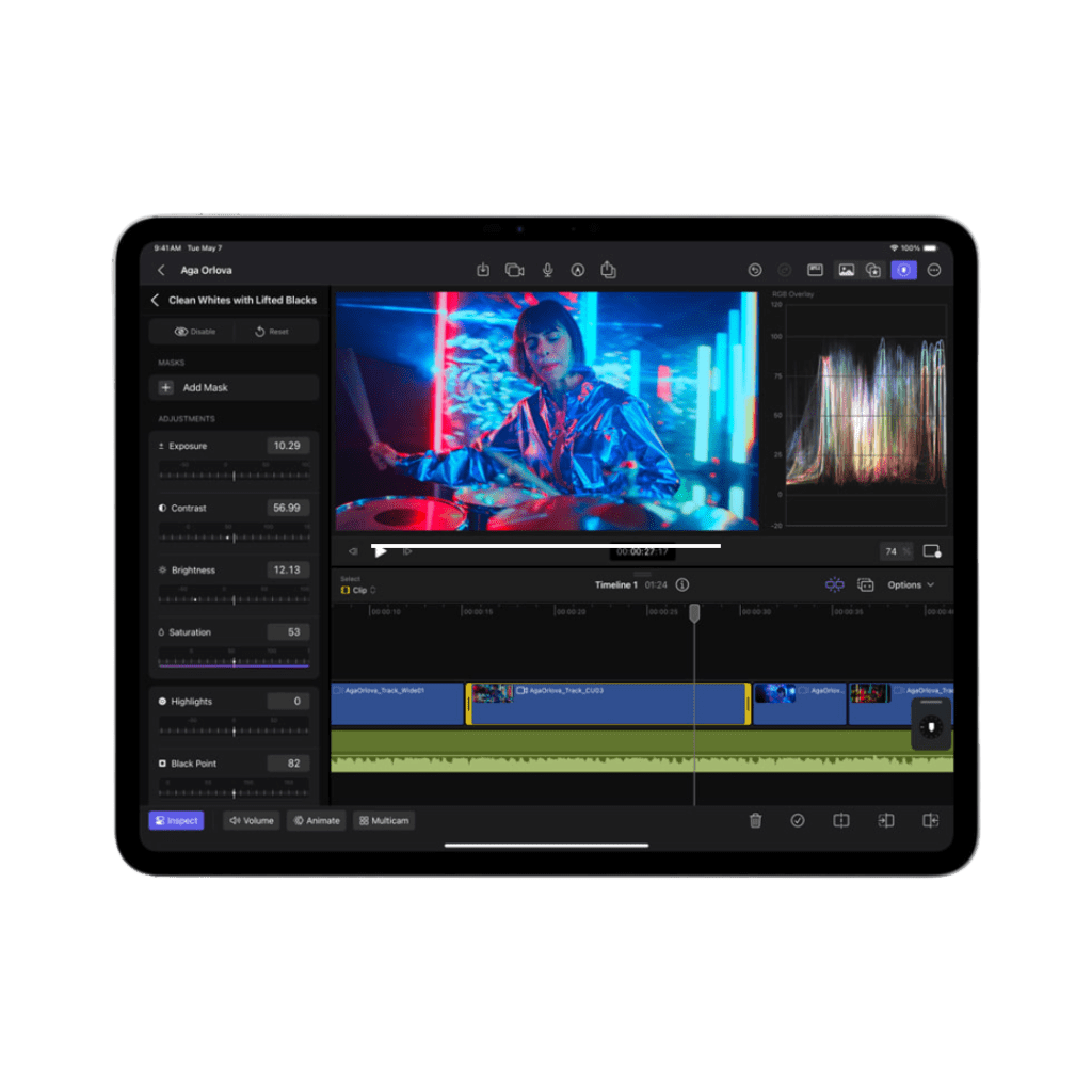 Final Cut Pro for iPad 2 delivers Live Multicam, an innovative new solution for users to capture up to four different angles of a single scene, whether working with their own devices or collaborating with others. Live Multicam connects wirelessly via Final Cut Camera, a new video capture app, enabling users to view up to four iPhone or iPad devices and providing a director’s view of each camera in real time. Each live camera feed can have settings adjusted right from Final Cut Pro for iPad 2 to easily dial in exposure, focus, zoom, and more for the perfect shot. Editable preview clips are immediately passed through to Final Cut Pro for iPad and replaced with full-resolution files in the background, so users can seamlessly move from production to editing.